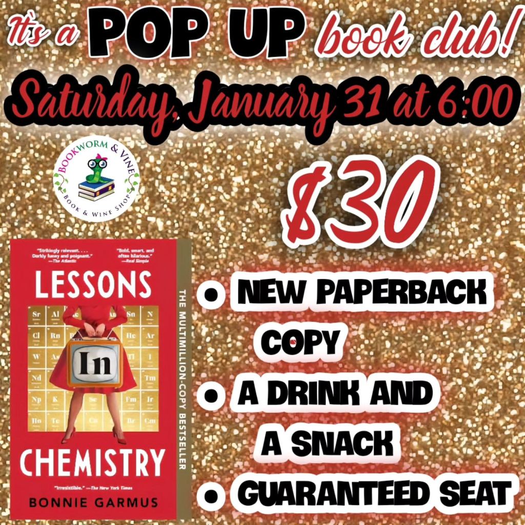 Join us Saturday, January 31 at 6:00 for a special one-night-only book club featuring Lessons in Chemistry by Bonnie Garmus.